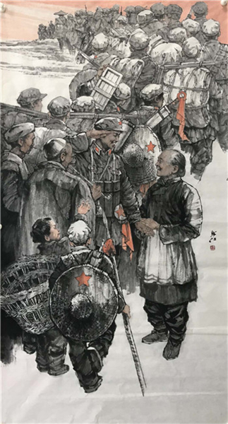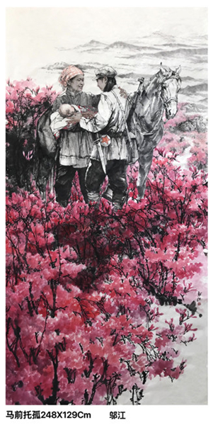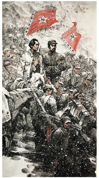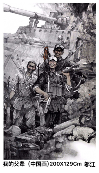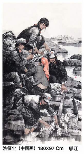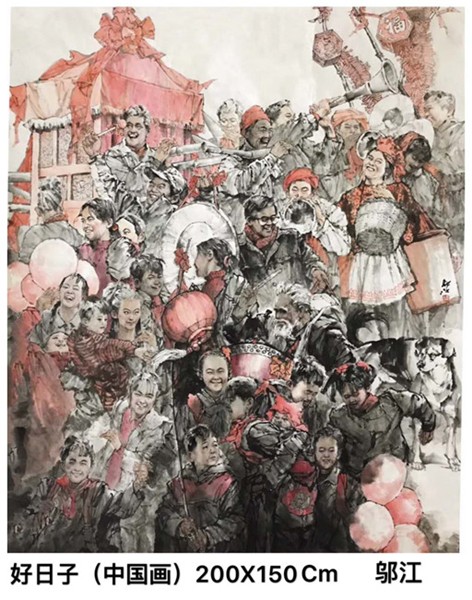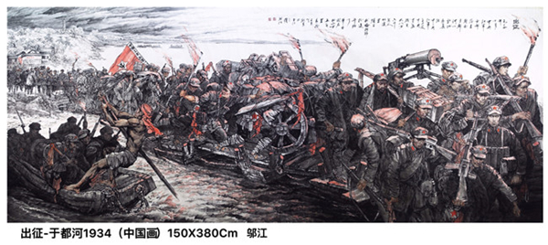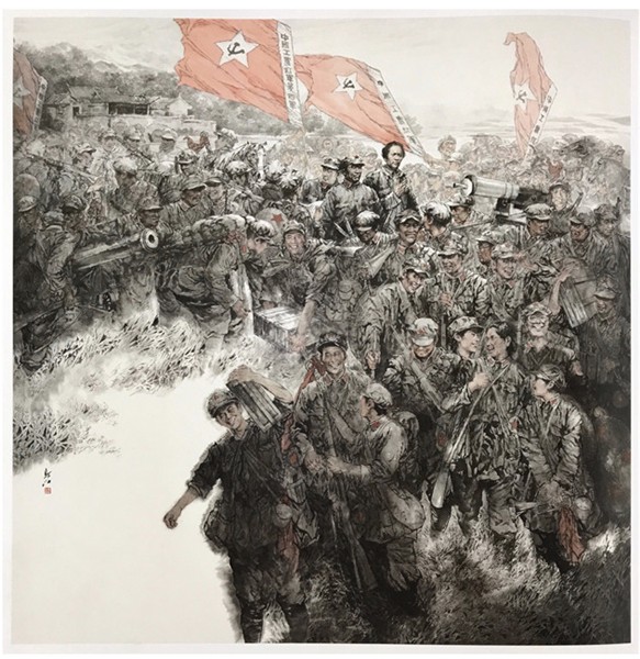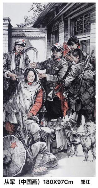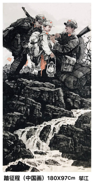 邬江国画作品邀请展(二丶红色题材类) 【 邬江艺术简介】 邬江,1958年8月生于江西赣州,毕业于郑州大学。现为中国美术家协会会员、国家一级美术师、中国画家协会理事丶中国民族文化艺术研究院副院长、北京水墨之韵画院特邀签约画家、三亚学院国艺研究院客座教授。 曾在《美术》、《解放军美术书法》、《解放军艺术学院学报》、《解放军画报》、《解放军报》、《中国书画报》、《中国美术报》、《美术报》、《报告文学》、《中国青年》、《中国妇女》、《中国投资证券》等国家级报刊发表作品400余幅。 出版有《邬江书画集》(中国工商出版社)、《趣画现代人格》(中国文联出版社)、巜鸿爪集》(广东人民出版社)、《21世纪有影响力画家个案研究―邬江卷》(吉林美术出版社)、《大画家-邬江》(天津人民美术出版社)、《印记.邬江中国画作品集》(天津人民美术出版社)。 被录入巜中国现代美术家辞典》、巜中国当代美术家名人录》丶巜中华人物大辞典》、《中国书画名家辞典.》等辞书。 重要作品收藏:解放军81美术馆、中国国家画院、北京荣宝斋、俄罗斯圣比得堡博物馆、澳大利亚多伦多大学、北京钓鱼台国宾馆、中央电视台、四川美术馆、江西美术馆、鲁迅美术学院、苏州美术馆、嘉兴美术馆、吉安美术馆、湖北省利川市政府。 中国美術家协会中国画艺委會、广东省美术家協會主办"印记.鄔江中国画作品展"2019年9月起相继在北京81美术馆、赣州美术馆、遵义美术馆、吉安美术馆、东莞香市画院美术馆举行。 1994年一在新加坡举办个人百幅书画作品展。 1997年一《丰收锣鼓》入选《今日中国美术.资料卷》(中央美术学院、北京大学、首都师范大学编著)。 2013年一《喜看稻菽千重浪》”启航中国梦“名家书画全国巡回展二等奖(首展全国政协礼堂)。 2013年―“墨韵华彩”刘大为师生作品展(北京)。 2014年—中国国家画院高研班作品展(北京)。 2014年一《客家妹系列》(5幅)中法建交50周年“中法书画名家作品展(北京)。 2014年一《捜尽奇峰》中国国家画院美术馆展出并被国家画院收藏(北京)。 2014年一《土家姑娘》俄罗斯圣彼得堡国家艺术博物馆收藏。 2014—《春晖》中央电视台收藏。 2015—《茶姑》钓魚台国宾馆收藏。 2015—《老房东》等10幅作品參加“笔墨的生命“中国国家画院名家师生14人邀请展(北京晋商博物馆)。 2015一《八子参军》(5幅)入选第三届全国架上连环画作品展〈中国美协主办、鲁迅美术学院收藏)。 2015―《烈火金钢》入选”古蜀文脉墨韵天府“全国中国画作品展(中国美协主办、四川美术馆展出并收藏)。2015―《知心话》等7幅作品參加“盛世翰墨“中国画名家临沂邀请展(山东临沂博物馆)。 2016一4《吉祥草原》入选“墨韵古蜀”全国中国画作品展(中国美术家协会主办、四川美术馆展出并收藏)。 2016,5一《正月里》入选”荣宝斋双年展2016“全国中国画展获优秀奖(最高奖)(中国美协主办,中国美术馆展出)。 2016,5一《正月里》北京荣宝斋收藏 2016,6一《风雪长征路》入选“庆祝中国共产党成立95周年“全国美术作品展(中国文联丶中国美协主办,中国国家博物馆展出)。 2016,6-22《风雪长征路》中央电视台"朝闻天下"新闻配图播出。 2016,7一《风雪长征路》入选"红船颂"庆祝建党95周年全国优秀作品巡展(中国美术家协会、浙江省嘉兴美术馆收藏)。 2016,8一《舞动的山寨》入选”美丽中国梦,七彩云南情“全国中国画作品展(中国美协主办、云南美术馆展出)。 2016,8一《一览众山小》入选”吉祥草原,丹青鹿城2016“全国中国画作品展(中国美协主办、包头美术馆展出)。 2016,9一《节日》、《阳光下》纪念中加建交46周年”中国当代著名美术家多伦多国际收藏展“(中国国际书画艺术协会主办,加拿大多伦多大学收藏)。 2016,10一《祝捷》入选”纪念长征胜利80周年全军美术作品展“获优秀奖(最高奖)(中央军委政治工作部、中国美术家协会主办,解放军八一美术馆展出并被收藏)。 2016,10一《永恒的誓言》(5幅)入选全国第四届架上连环画展(中国美术家协会主办、鲁迅美术学院收藏)。 2O16,12一《草原盛会》入选"写意.苏州"(人物篇)全国中国画双年展获优秀奖(最高奖)(中国美术家协会主办、江苏省美术馆展出并收藏)。 2017,1一《祝捷》在《解放军美术书法》杂志2017年第一期发表。 2017,6一《雪山壮歌》入选"中国(南昌)軍事美术作品展"获优秀奖(最高奖)(中国美術家協會主办丶江西省美術館展出并收藏)。2017,7一《我的父辈》入选庆祝建军90周年全国美展暨第十三届全军美术作品展(文化部、中央军委政治工作部、中国美术家协会主办,中国美术馆展出)。 2017,8一《我的父辈》在《美术》杂志2017年第八期发表。 2017,9-《我的父辈》入选"庆祝建军90周年全国美展优秀作品临沂特邀展"(中国美术家协会、山东省临沂市人民政府)。 2017,10-《盛装》、《丽日》、《采茶姑娘》、《阳光灿烂的日子》四幅参加纪念中加建交47周年第二届"中国当代著名美术家多伦多国际收藏展"(中国国际书画艺术协会主办、加拿大多伦多大学收藏)。2017、11《祝捷》在《解放军艺术学院学报》2017年第二期封底发表。 2017、12-受聘三亚学院国艺研究院客座教授。 2018,1-《大画家-邬江》出版,全国新华书店发行(天津人民美术出版社)。 2018、3